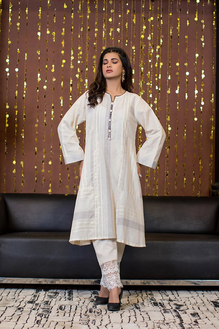 The ensemble begins with dobby cotton patchwork at the front, sleeves, and neck, exuding sophistication. The shirt is tailored to perfection with intricate lacework at the front and a solid back, creating a cohesive and effortlessly stylish look. Puckered buttons at the placket and diamond motifs make it a versatile piece that can easily transition from casual to formal occasions.