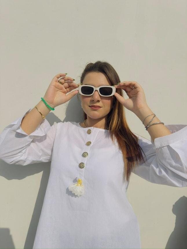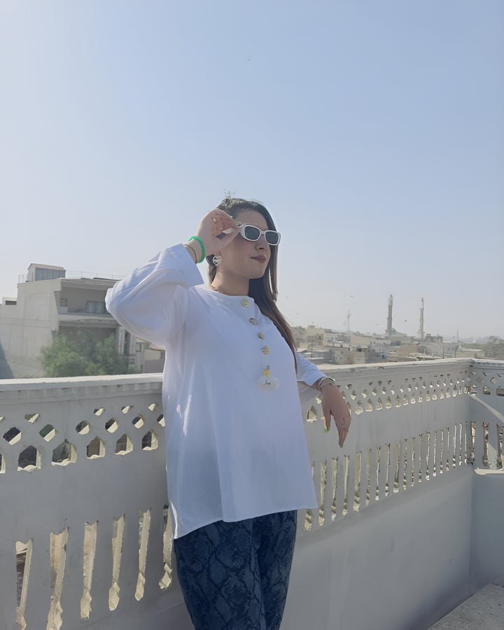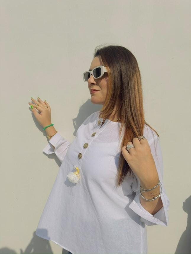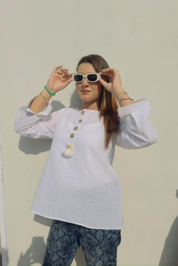 Solid embellished shirt with four large embossed buttons and heavy hanging seashell tussles for a confident look.