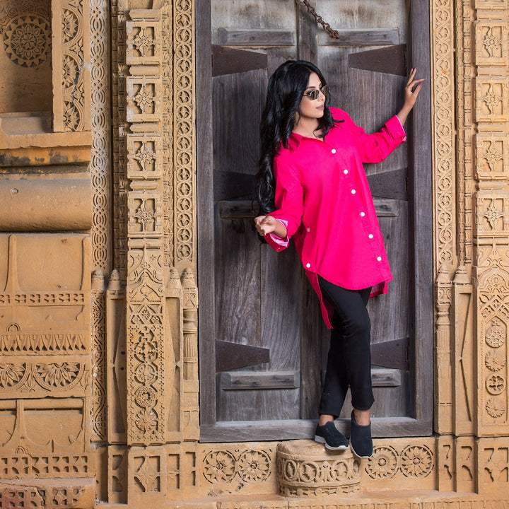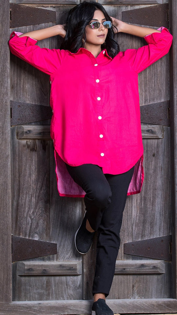 A classically rich composition is portrayed on this elegant collarshirt rendered in a red shade with cuff opening . It features a chic and modern silhouette shirt crafted in a contemporary silhouette with a button down shirt and side slit with button opening  Embellished with sea shell trendy buttons at front , collar an side slit