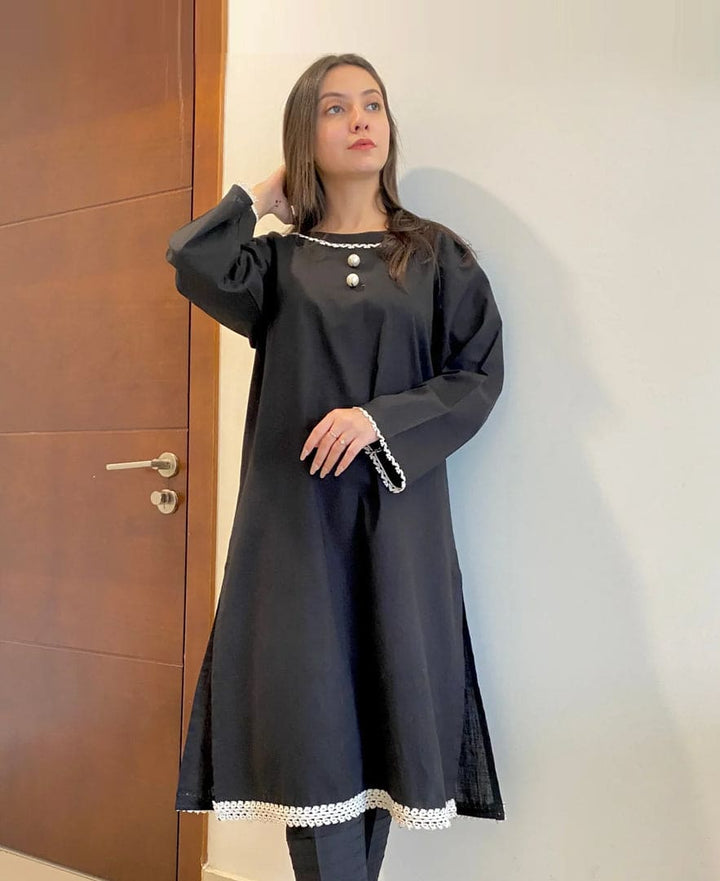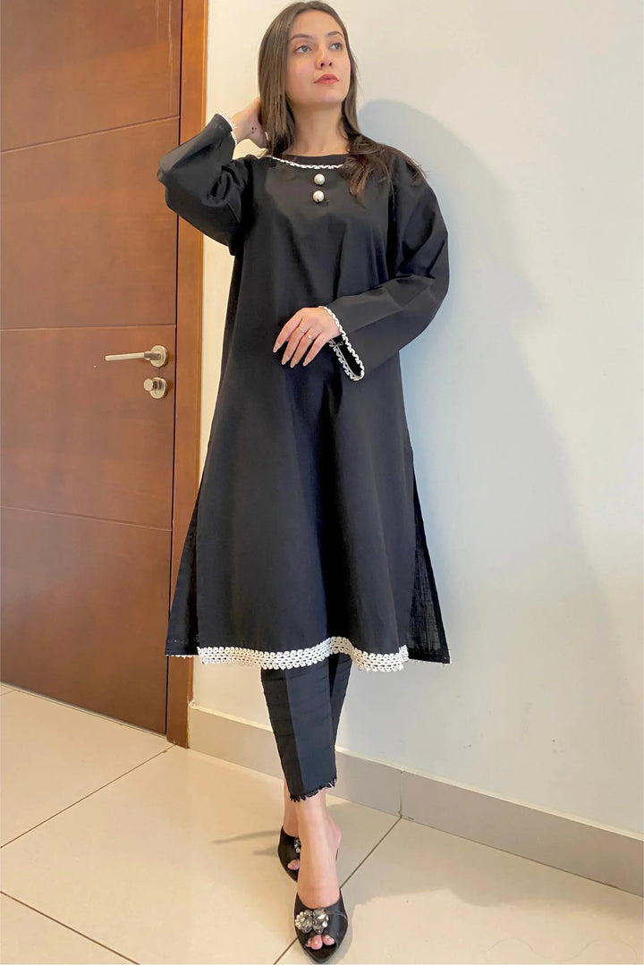 Elevate your wardrobe with this timeless stitched shirt, crafted from 100% premium cotton for unparalleled comfort and durability. The classic, minimalist design features intricate white lace detailing on the neck and daman, adding a touch of sophistication without overpowering the overall aesthetic. This versatile piece is perfect for both casual and formal occasions, making it a must-have for any discerning gentleman.