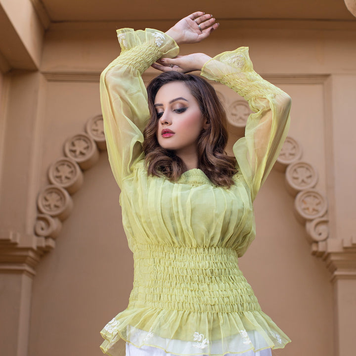 Urban Cut Embroidered Edges Top with Elastic Ruffle Frilled Shirt 1 Piece