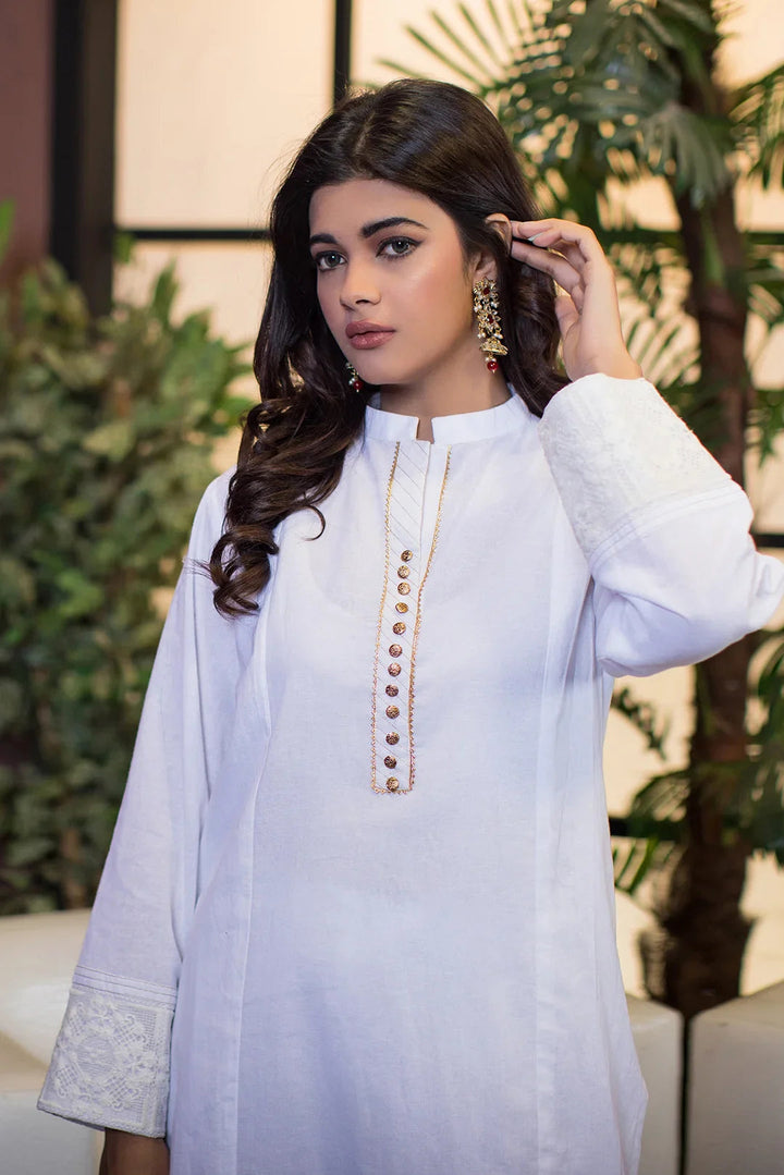 Solid embellished kurta featuring Kalee work at the center, heavy embroidery at the sleeve openings, metal buttons, golden intricate lace on the neck, and golden anchor stitch work and sleeves for added confidence and traditional admiration.