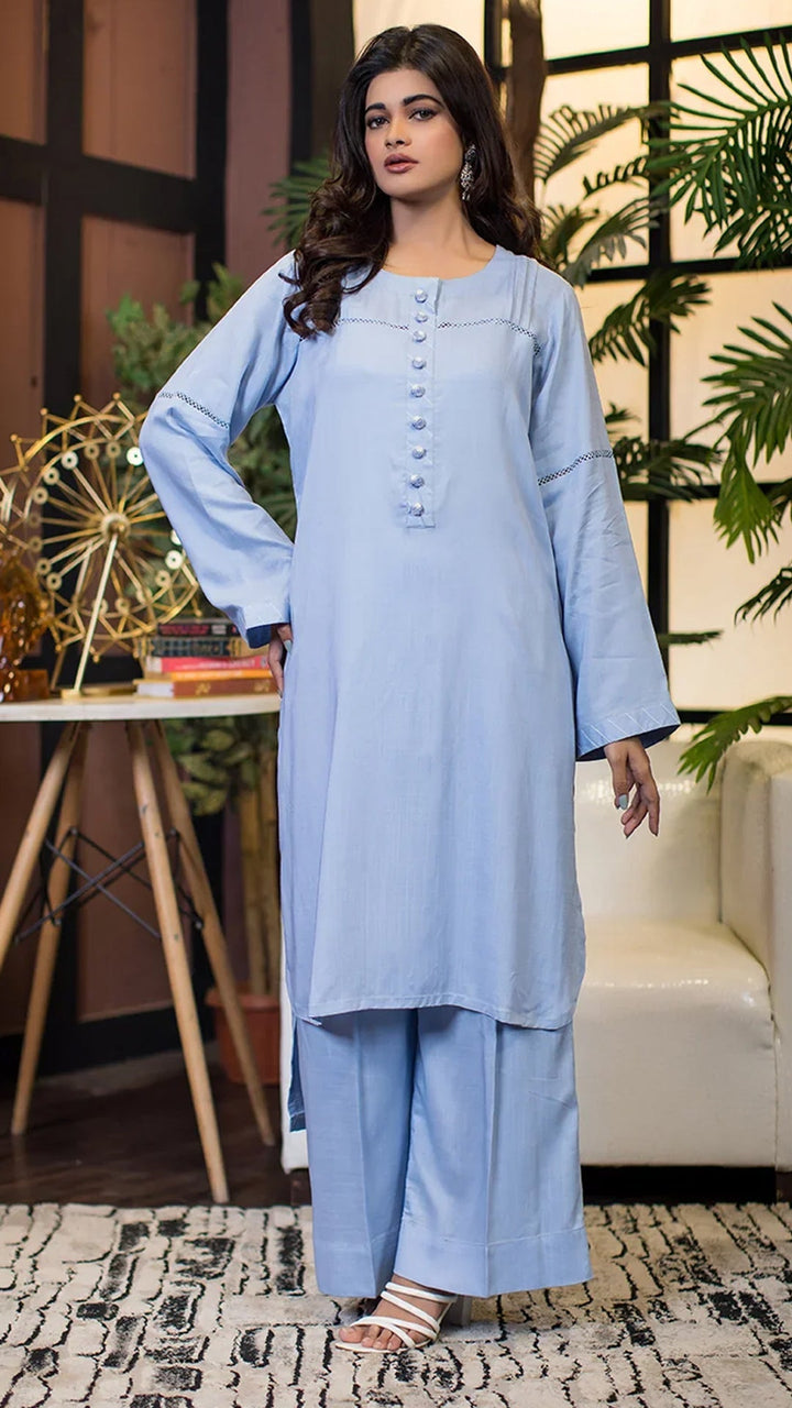 Brighten your wardrobe with this lovely long blue shirt. The anchor white thread work at palcket and sleeves with pushed embroidered buttons adds sophistication. The pleated neck area with intricate lace and stylish look in the extra-long back depict a confident look for casual or party wear.
