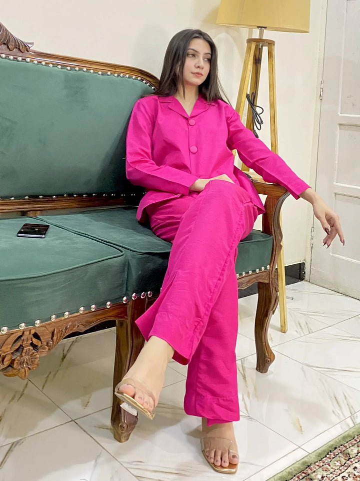 Upgrade your wardrobe with this stylish 2-piece coord set, featuring a shirt adorned with matching buttons and trousers with convenient pockets. The shirt is designed with sleeves that feature button detailing. Perfect for an effortlessly chic look, this coord set blends practicality with understated elegance.