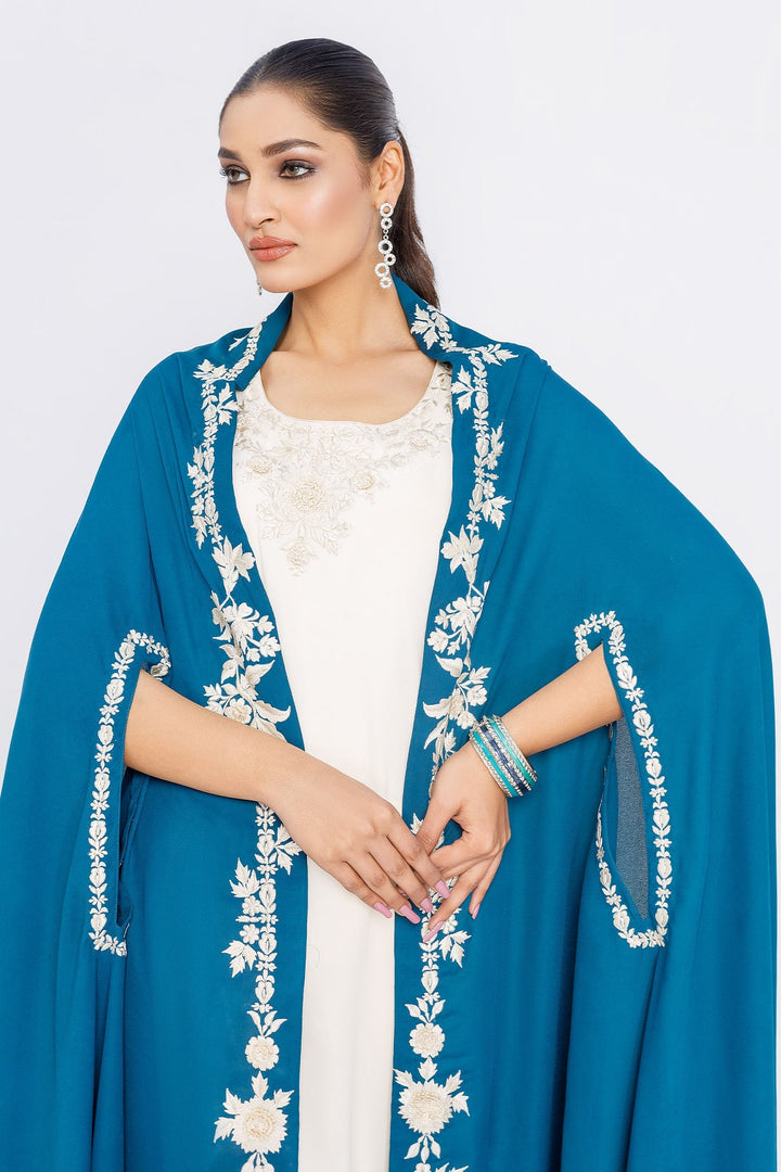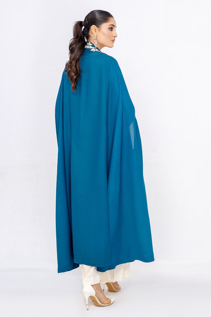 An extravagant cape in a stunning shade of teal. Comes with a contrasting inner set. The embroidery on the cape adds a regal touch to the entire look.