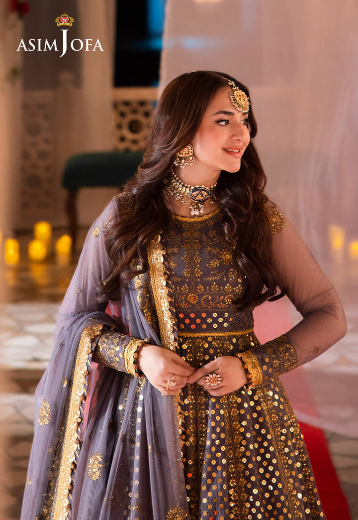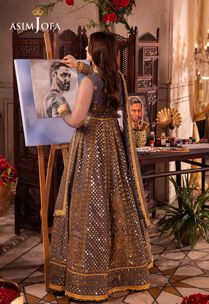 Like a timeless masterpiece unearthed from antiquity, this ensemble in smoky hues is adorned with celestial accents. Its embroidered Peshwas, a paragon of elegance, is embellished with threads of molten antique gold zari, their dance with sequins mimicking the cosmic shimmer on moonlit shores. A diaphanous dupatta, woven with threads of opulence, completes this astral tableau, elevating its ethereal beauty to elysian heights.