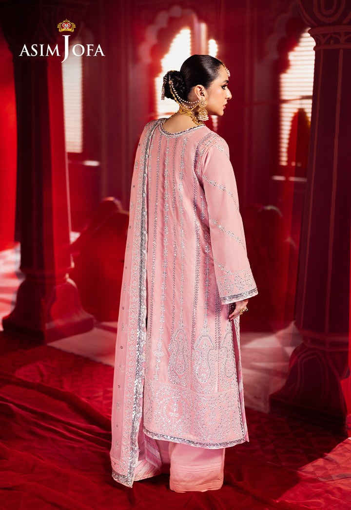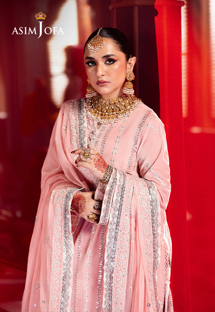 Bathed in the soft glow of a flamingo hued rose, this light pink ensemble is a delicate ode to feminine grace and elegance. The velvet shirt, a canvas of refined beauty, features multiple embroidered panels, where silver doriwork and zari threads intertwine like moonbeams across a serene sky. Silver cupped sequins glisten like droplets of dew, catching the light with every movement. Paired with an embroidered dupatta, this ensemble becomes the very essence of grace, transforming you into a vision of timeless allure.