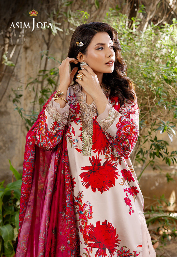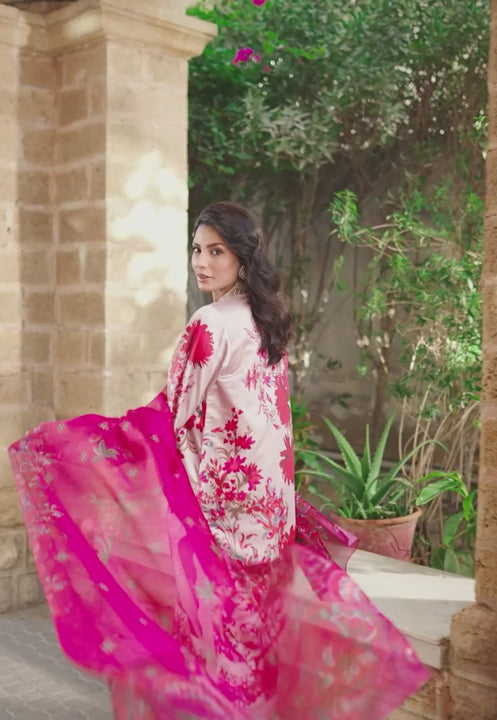 The soft hue of the shirt sets a graceful backdrop for a deep red print, reminiscent of a blooming rose garden in full charm. The neckline adds a striking focal point, enhancing the beauty of the overall design. Paired with plain trousers and a richly printed dupatta in deep, moody tones, this ensemble embodies timeless elegance with a romantic flair.