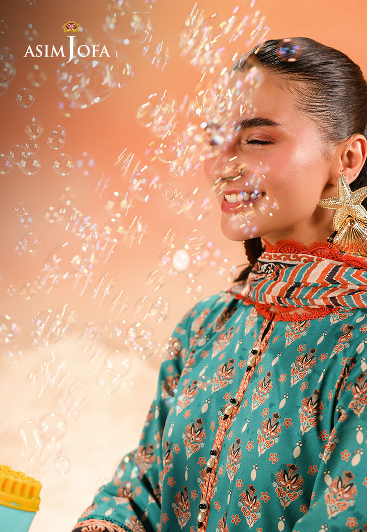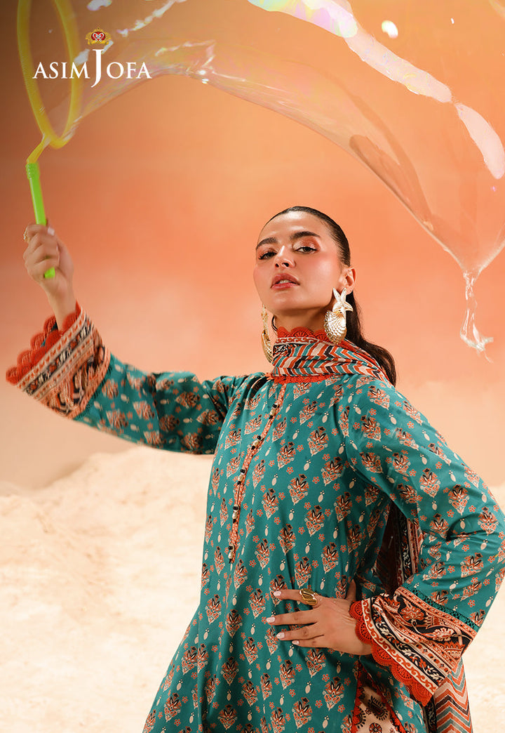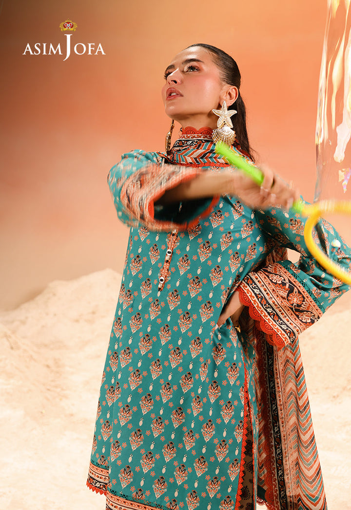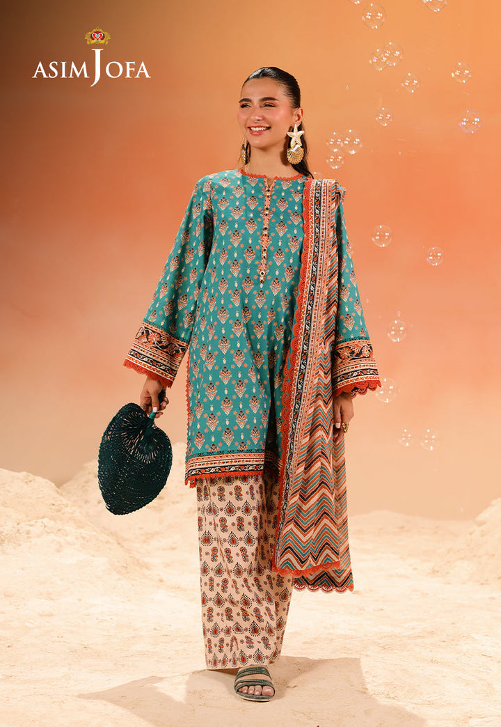 Art and attire blend in this teal ensemble where the shirt and trousers showcase contrasting prints that spark intrigue. A chevron-designed printed dupatta adds movement like ripples on a sunlit lake, completing a look that feels effortlessly expressive.