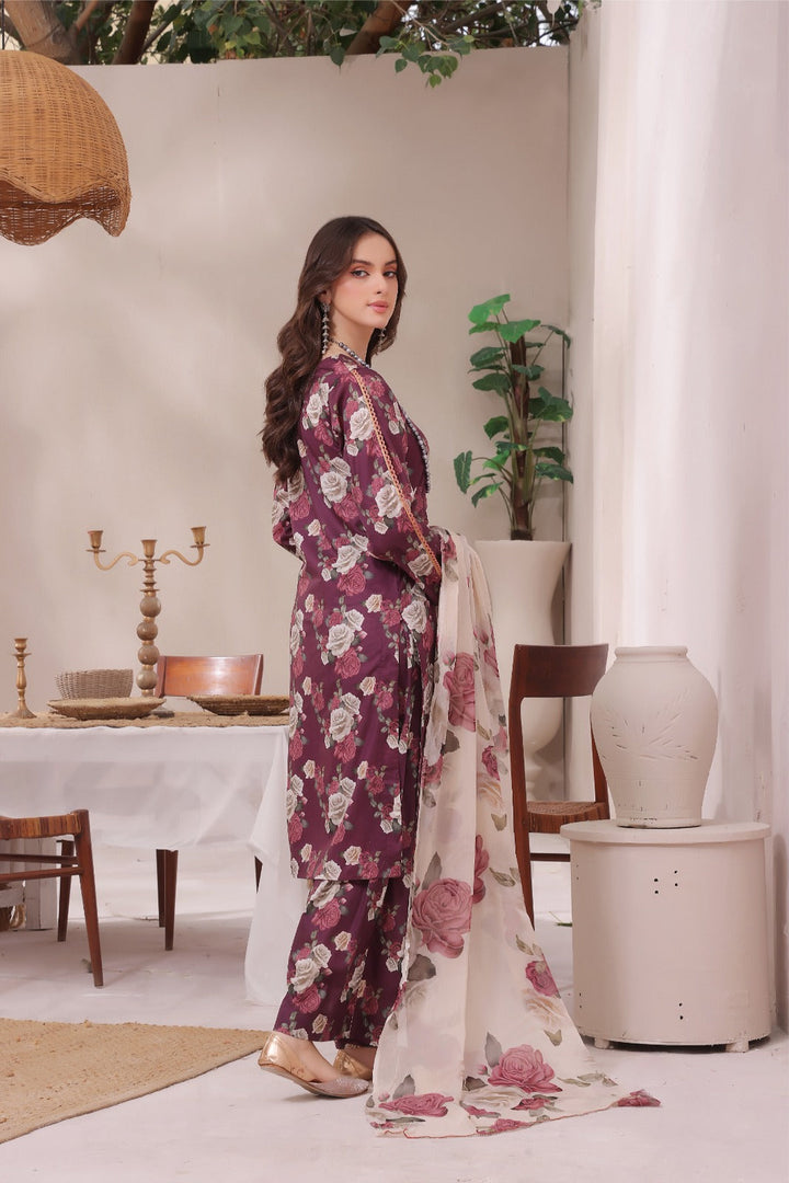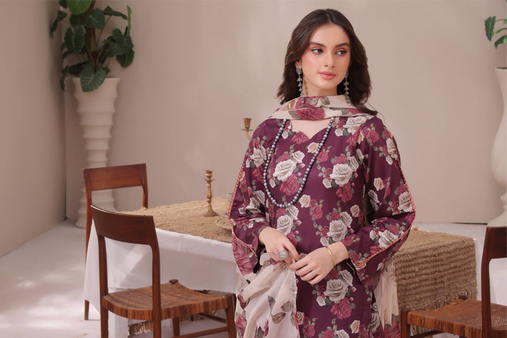 The article includes:Unstitched 3PCDigital Printed Shirt 3 yardsDigital Printed Chiffon Dupatta Digital Printed Trouser 2.5 yards