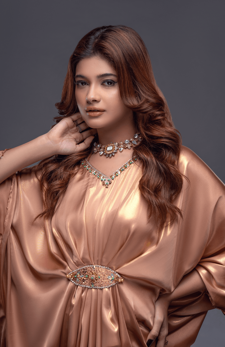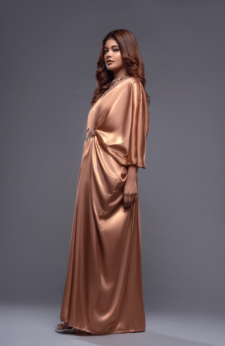This exquisite copper kaftan, made from luxurious satin silk, showcases a graceful flowing silhouette. Adorned with intricate handwork on the neckline and a striking brooch, it effortlessly combines timeless elegance with modern sophistication, making it perfect for any special occasion.