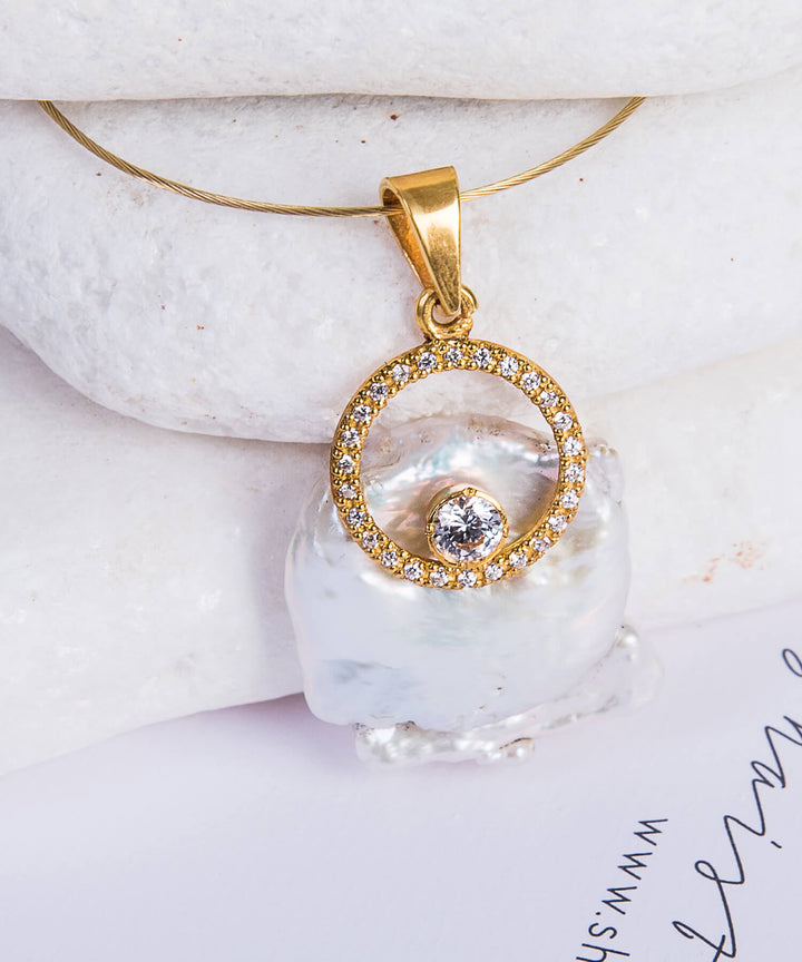Unleash your positive energy with this Pendant. It's iconic design symbolizes power and grace, features a thick Flat Baroque Pearl, topped with a beautiful ring encasing Zircons and a bigger Zircon crystal in the center. Isn't it something that you'll never want to give away?