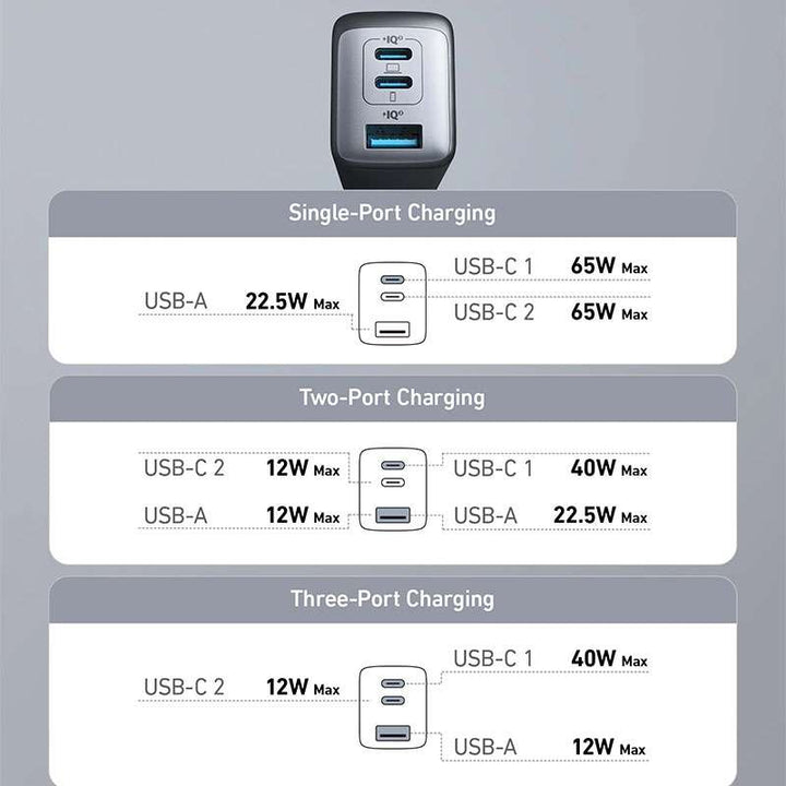 Connect a single device to get a 65W max chargeÂthat’s enough to power up a 2020 MacBook Pro 13? at full speed. And when you connect three devices, power will be distributed efficiently between ports to ensure you get the best charge.