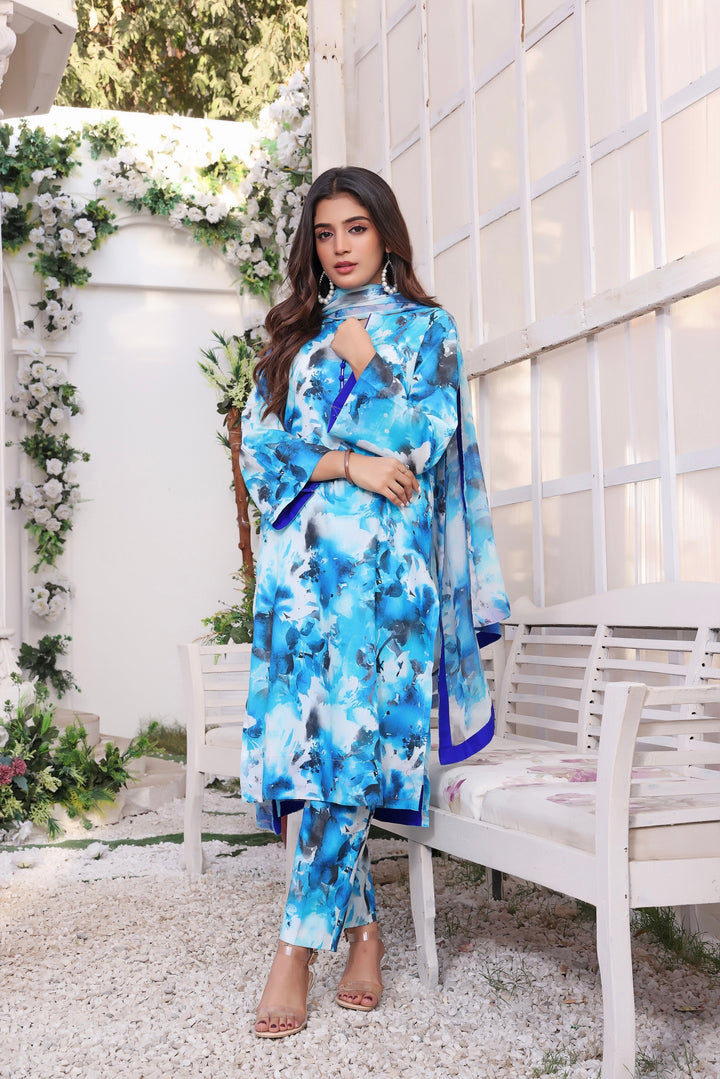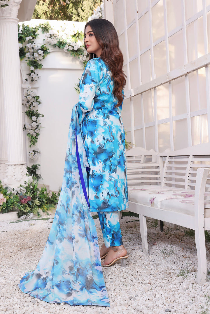 The article includes:Unstitched 3PCDigital Printed Shirt 3 yardsDigital Printed Chiffon Dupatta Digital Printed Trouser 2.5 yards