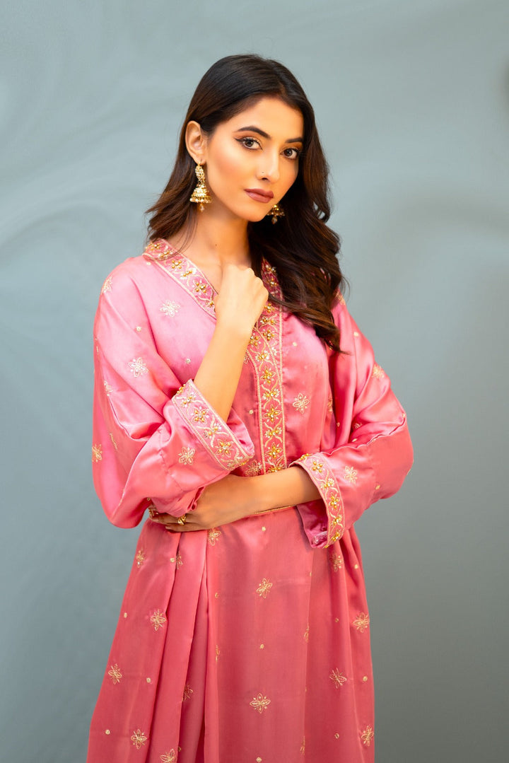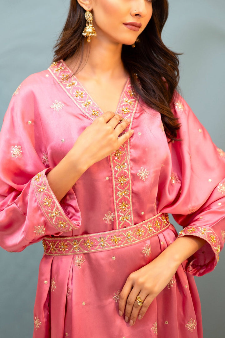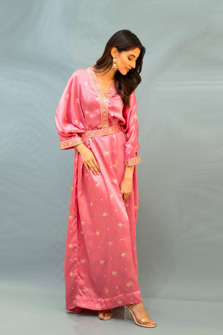 Bring out your feminine charm in this glamorous sequin-embroidered kaftan designed in satin silk, featuring detailed handwork on the elongated V-neck and belt. Its flowing silhouette and radiant color bring a perfect blend of elegance and modern charm to this exquisite piece.