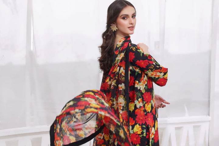 The article includes:Unstitched 3PCDigital Printed Shirt 3 yardsDigital Printed Chiffon Dupatta Digital Printed Trouser 2.5 yards