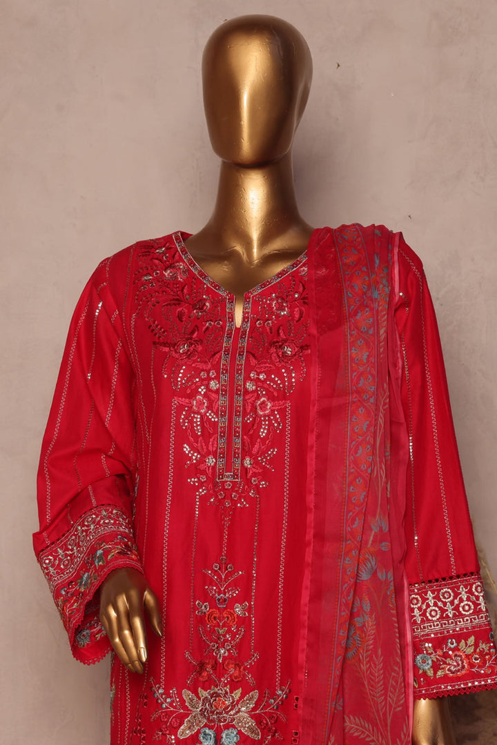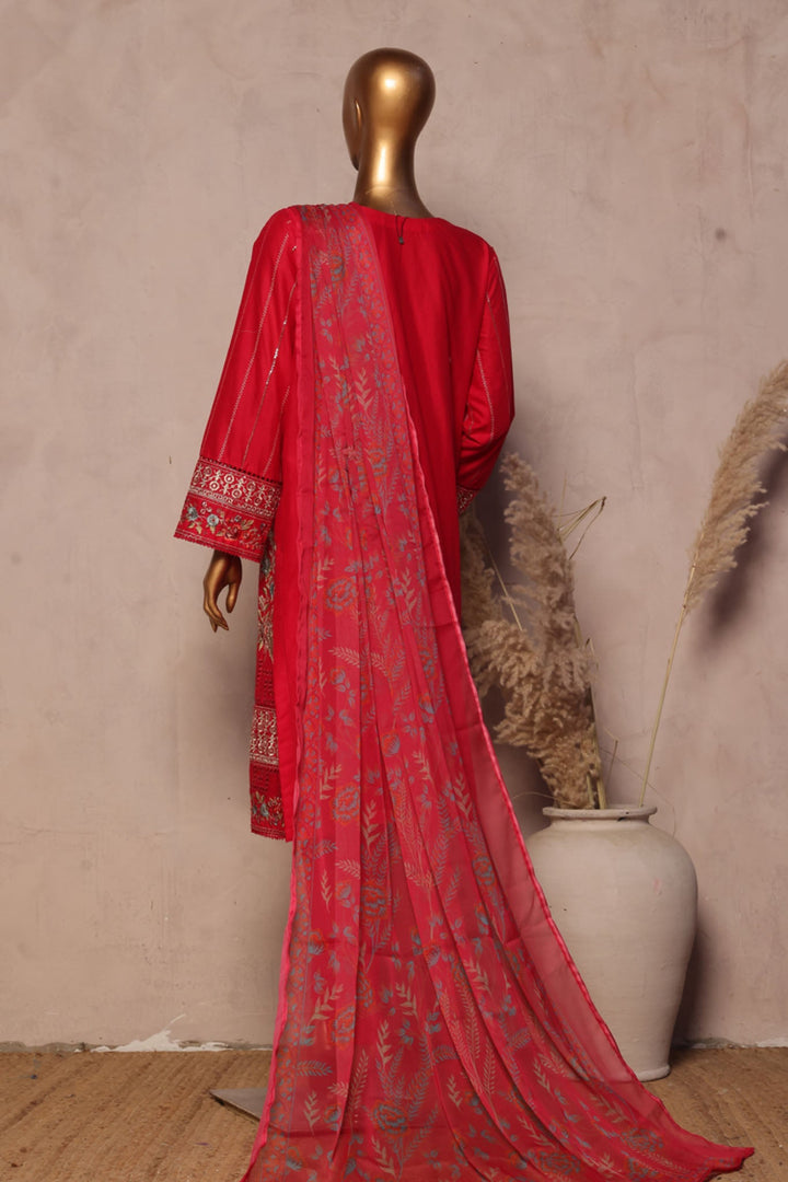 Bin Saeed Stitched 3 Piece Luxe Plain Cotton With Chiffon Dupatta Collection'2025-SMPC-1957-Red