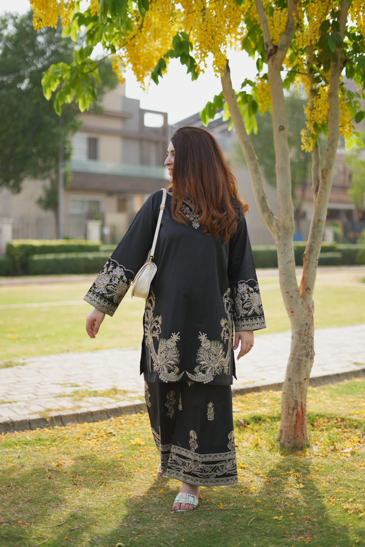 Make a striking impression with this crow black two-piece outfit, where elegance meets edge. The short-length shirt features an embroidered neckline and detailed patchwork along the left and right hem borders, adding a touch of sophistication. The loose-fit trousers are adorned with delicate boti embroidery, offering a graceful finish. Designed for effortless style and comfort, this set is perfect for evening wear and chic daytime looks.