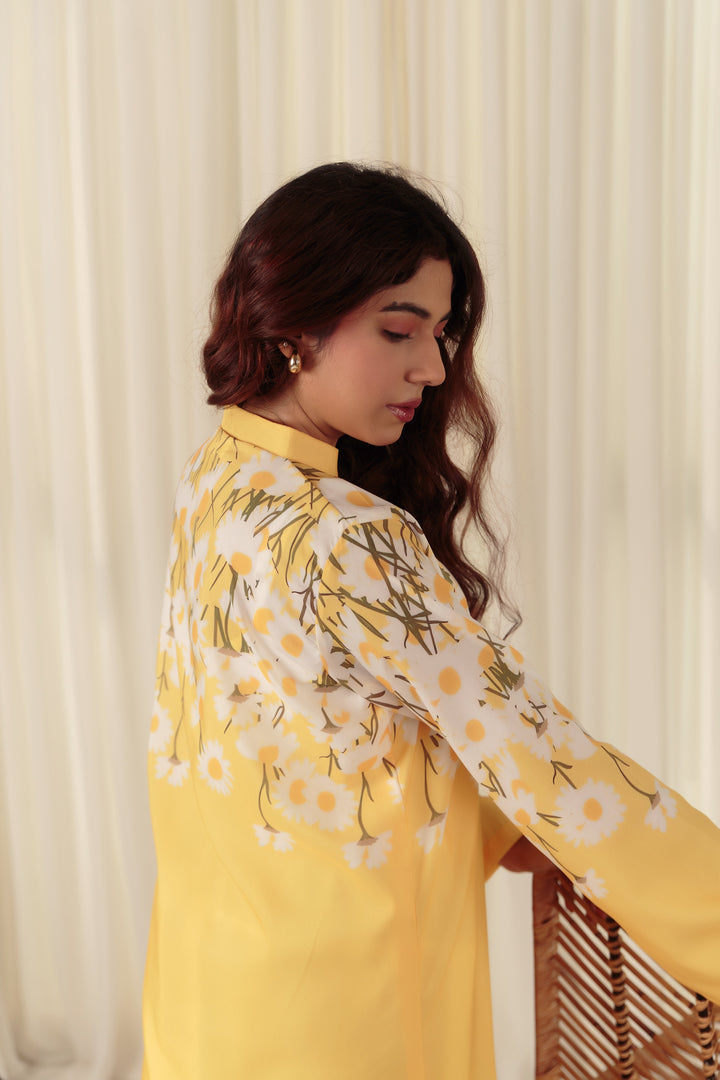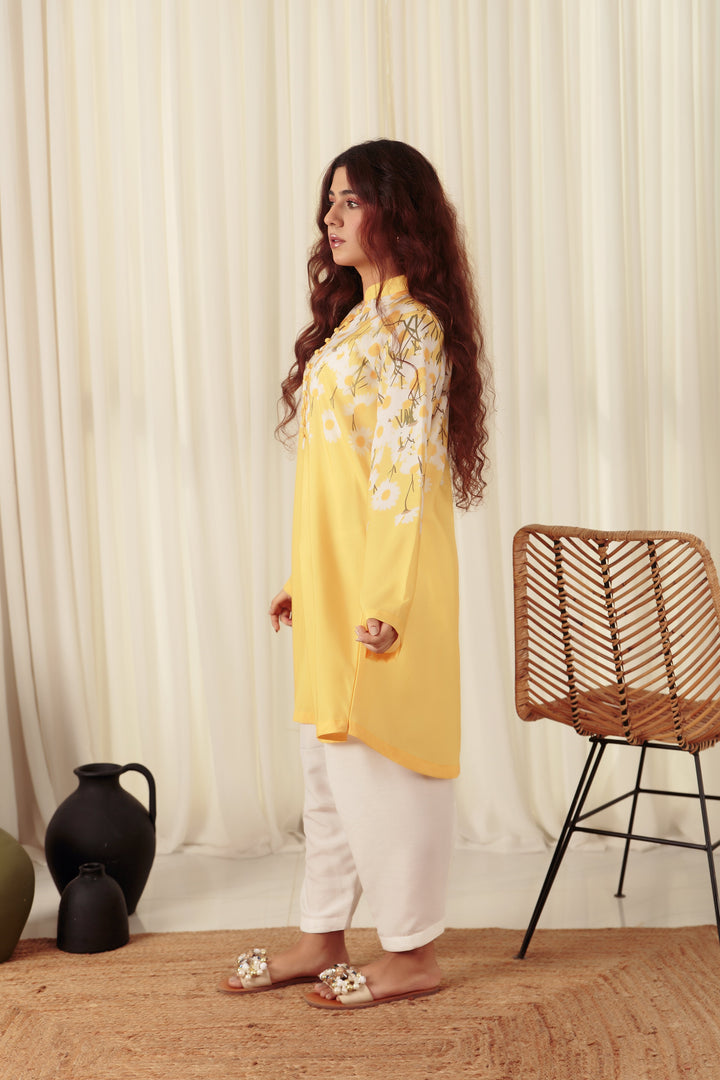 Printed shirt with buttons on neckline paired with plain white shalwar to complete the look