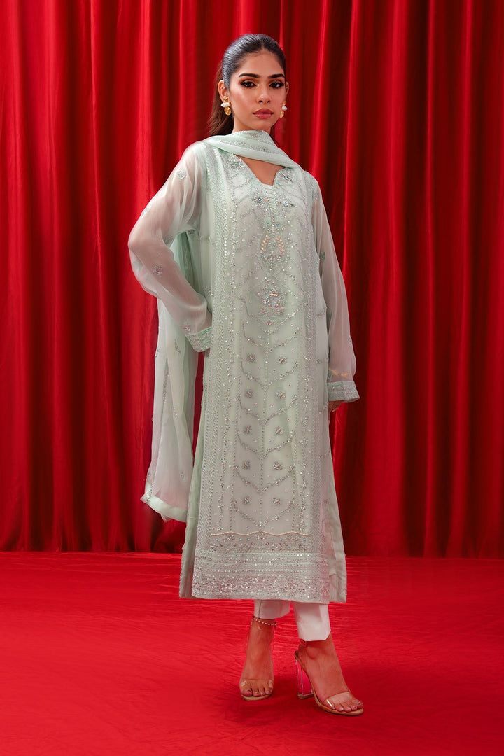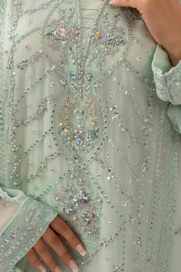 "Top: Mint Chiffon Kurta with Hand Adda Work, Sequence Embroidery and Malai Crepe Inner