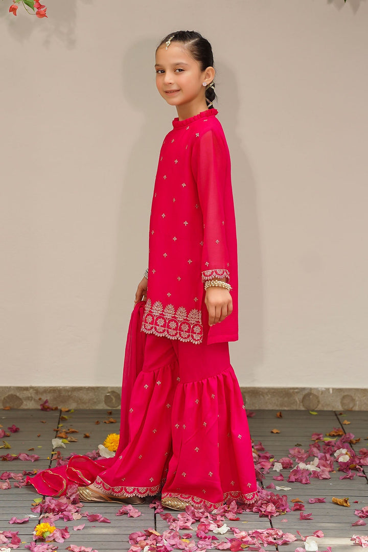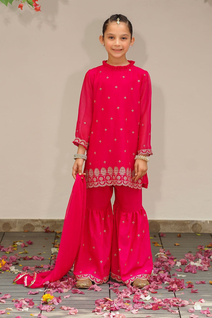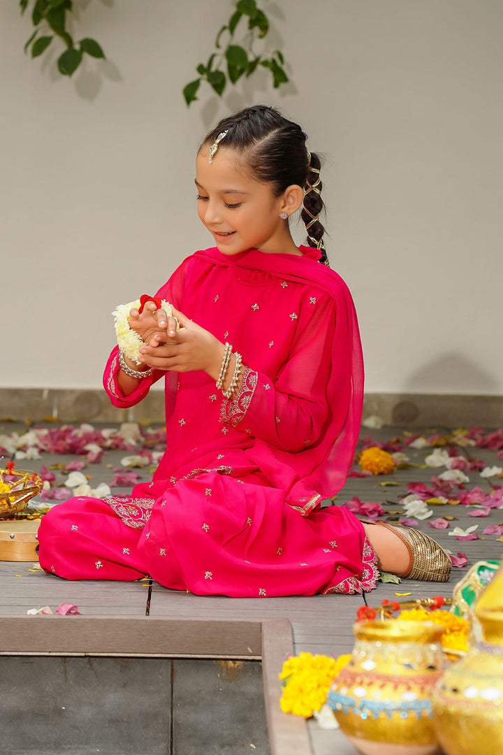 Top: Hot Pink Chiffon Kurta with Embroidery and Malai Crepe Lining