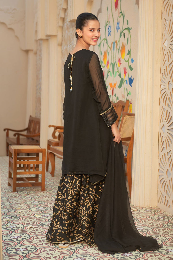 Bottom: Black Malai Crepe Gharara Pant With Screen Print Dupatta: Black Chiffon Dupatta