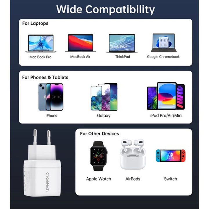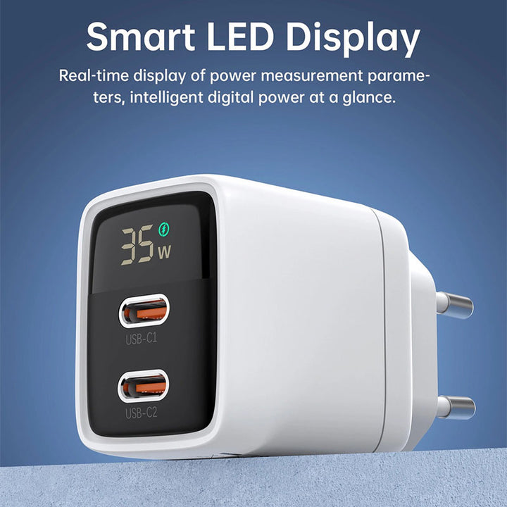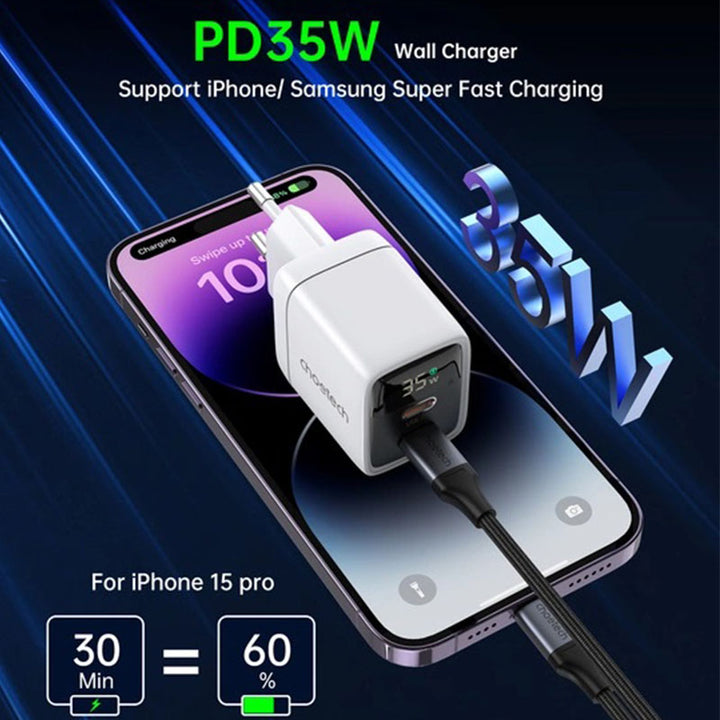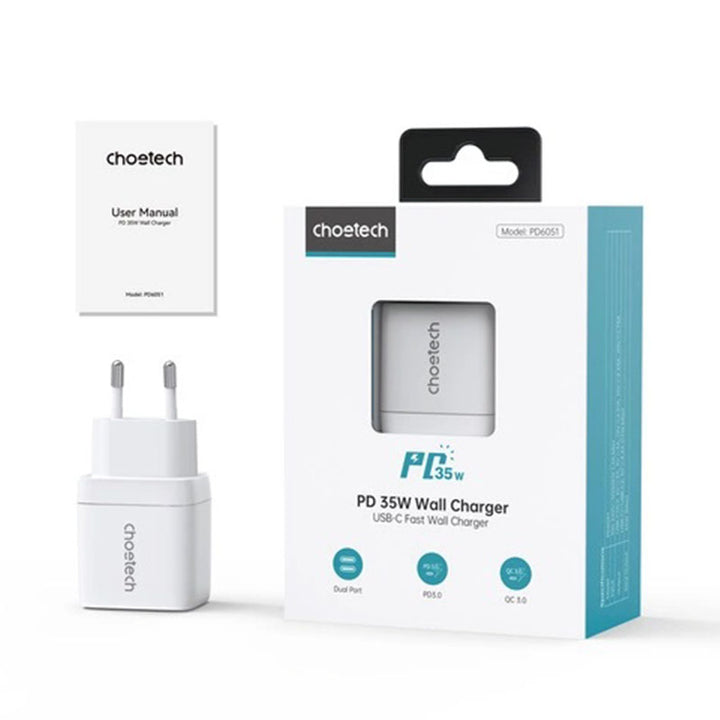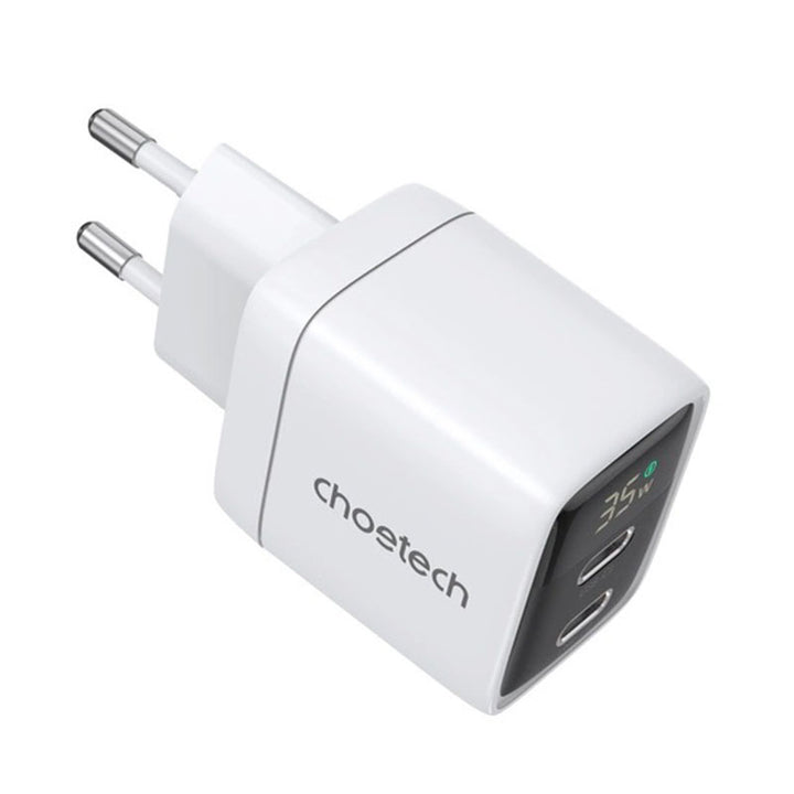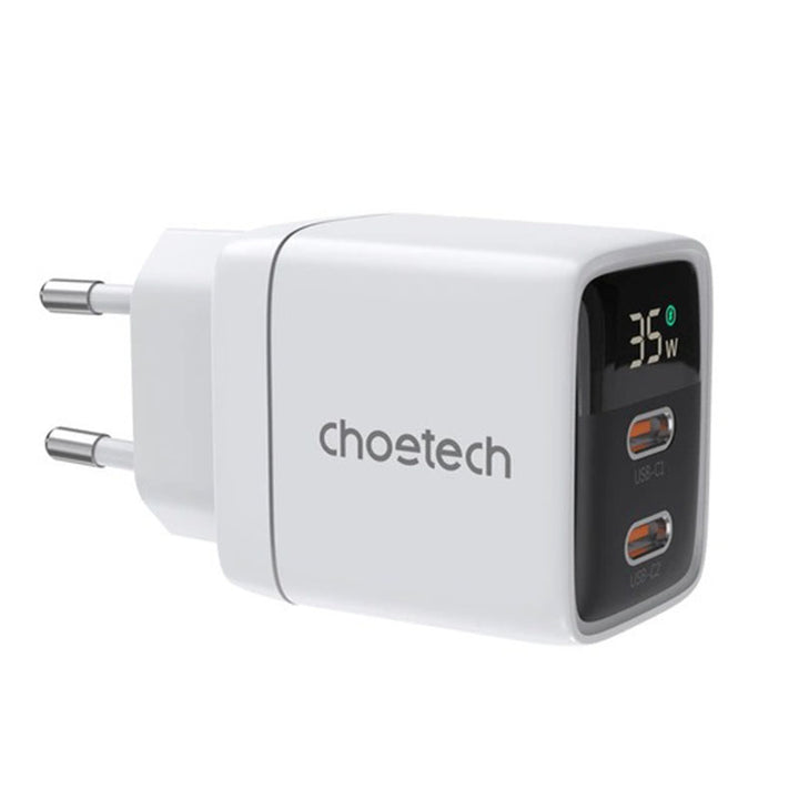 Upgrade your charging game with the Choetech PD6051 2x USB-C PD 35W GaN Wall Charger with Display. This best quality wall charger features advanced GaN technology for a compact design and efficient power delivery. With dual USB-C ports, it supports fast charging for multiple devices simultaneously.