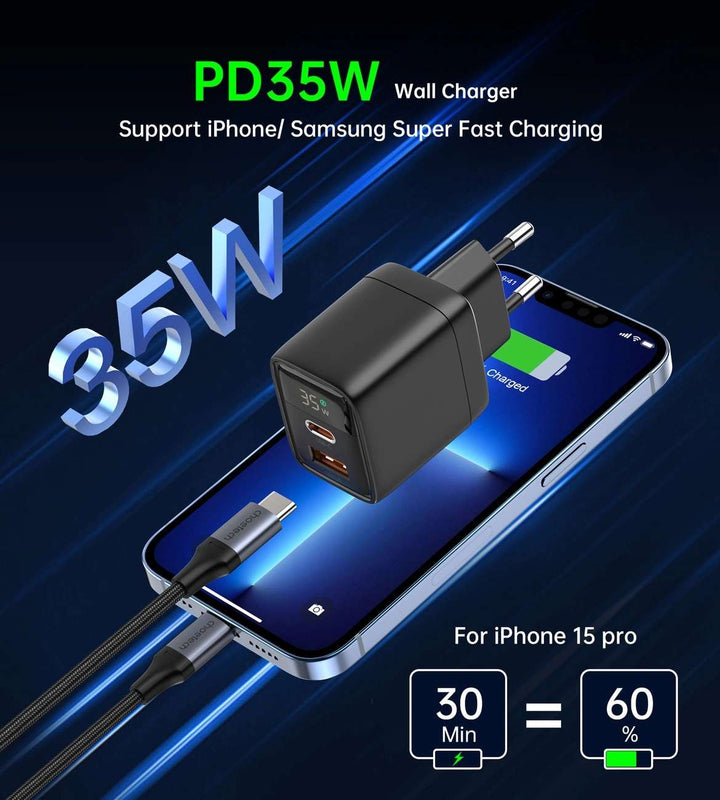 Equipped with Power Delivery (PD) technology, this charger delivers up to 35W of fast charging power, making it perfect for your USB-C laptops, tablets, smartphones, and other devices.