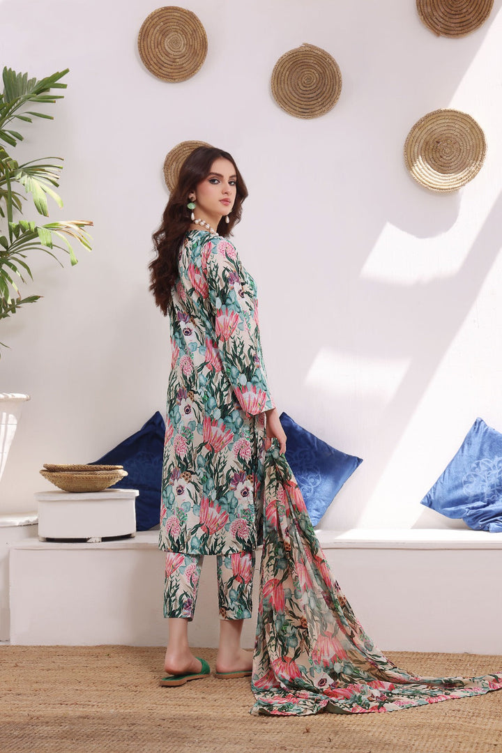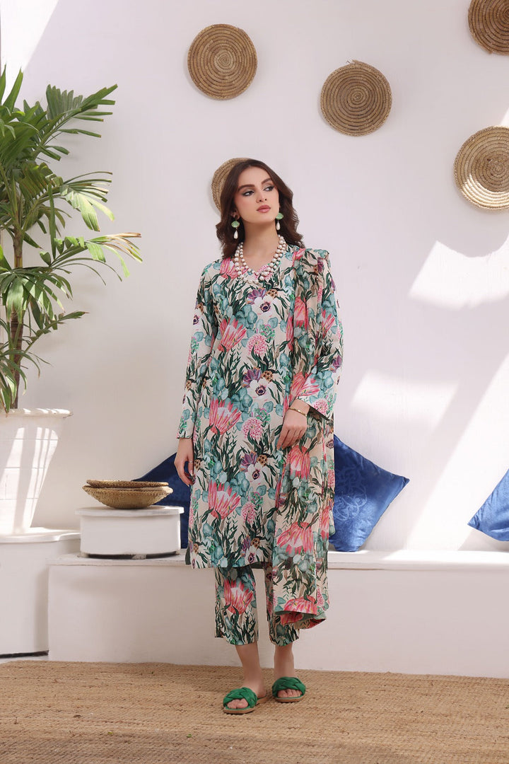 The article includes:Unstitched 3PCDigital Printed Shirt 3 yardsDigital Printed Chiffon Dupatta Digital Printed Trouser 2.5 yards