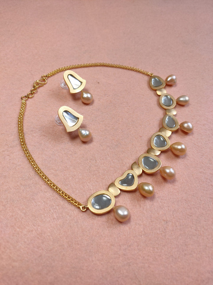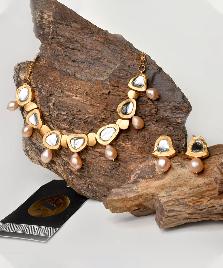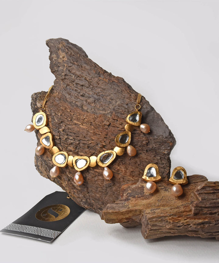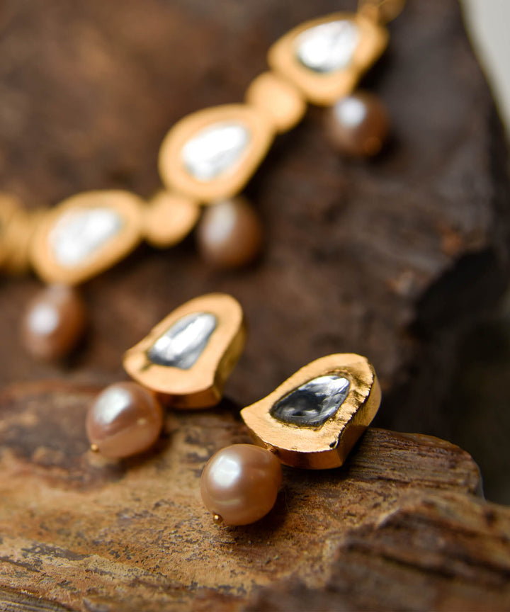 Handmade and hammered to perfection. Clutch set is a depiction of excellent craftsmanship. Organic shapes encasing Kundan and Natural Oval Freshwater Pearls create an illusion of natural beauty.