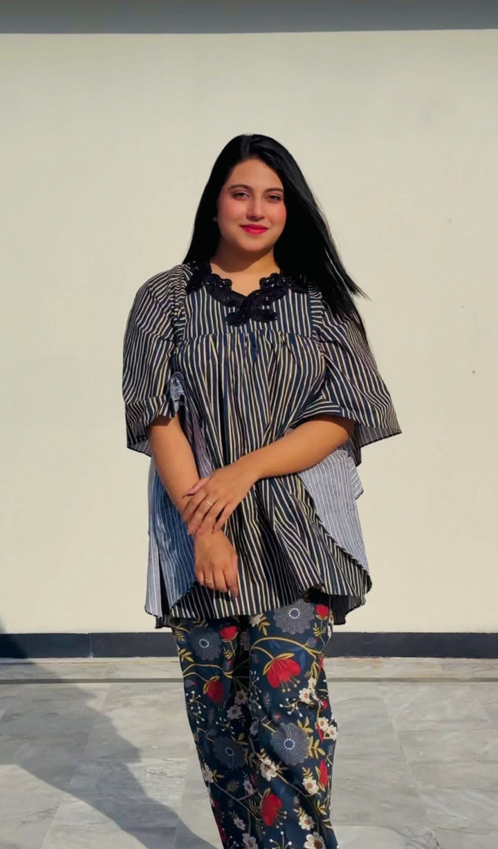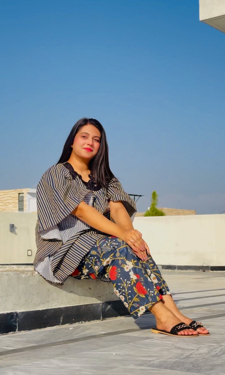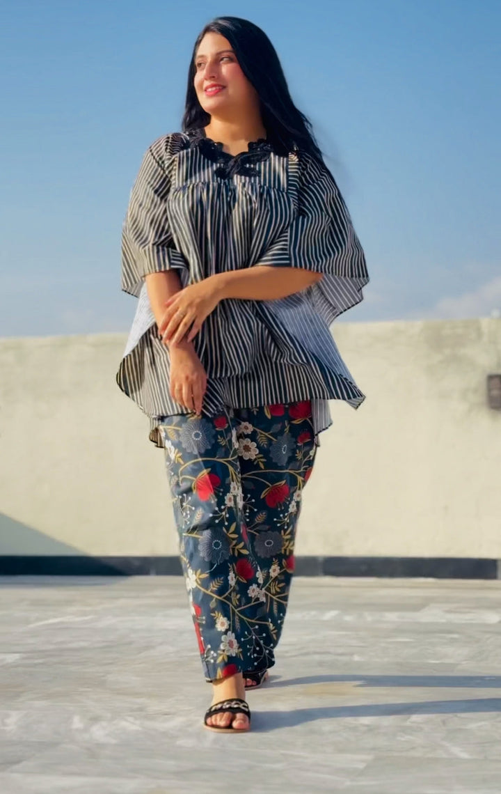 Opt for a unique style with our Co- Ord set. Featuring blue/beige abstract print with a embroidered neckline . Paired with pants showcasing red floral print #for a unique look. |