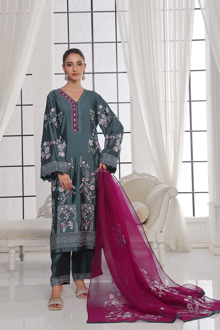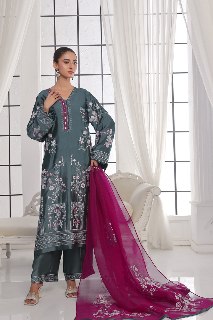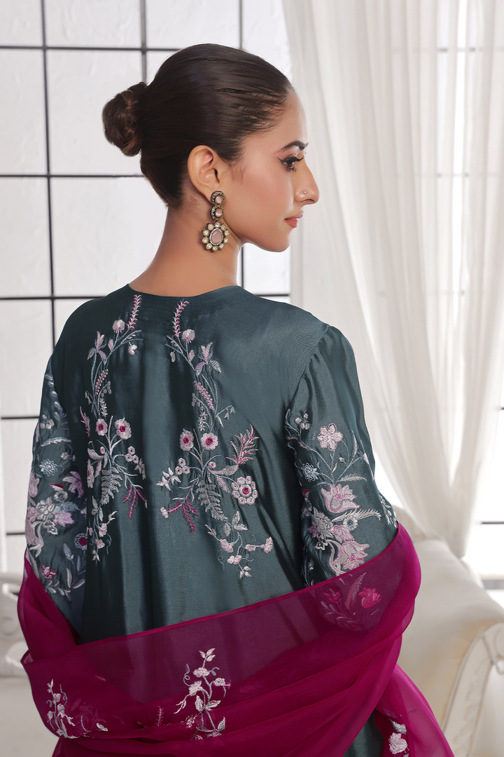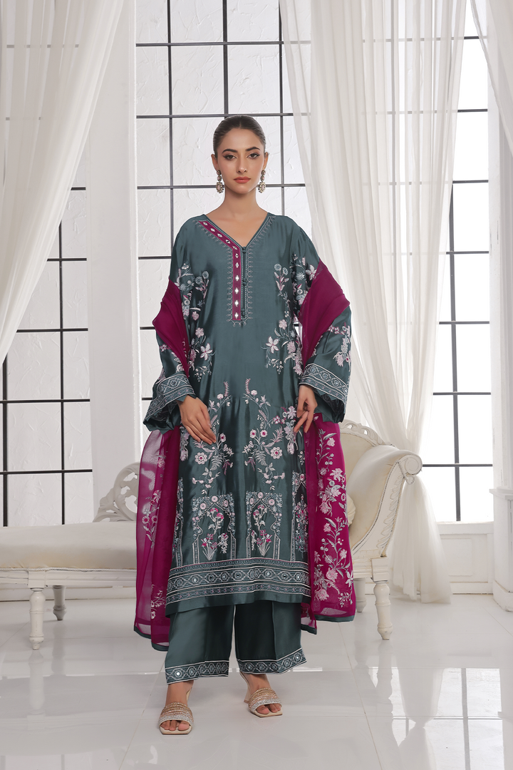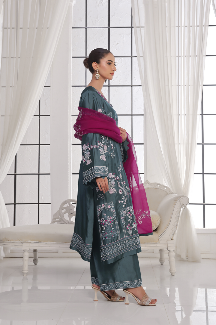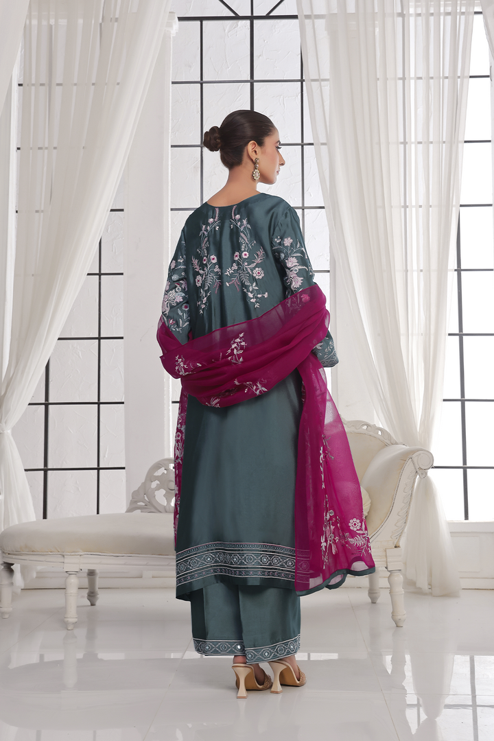 A captivating teal outfit adorned with exquisite embroidery and mirror accents. The rich magenta dupatta adds a regal touch.
