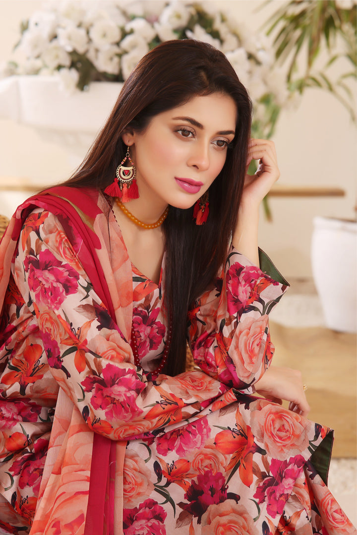 The article includes:Unstitched 3PCDigital Printed Shirt 3 yardsDigital Printed Chiffon Dupatta Digital Printed Trouser 2.5 yards