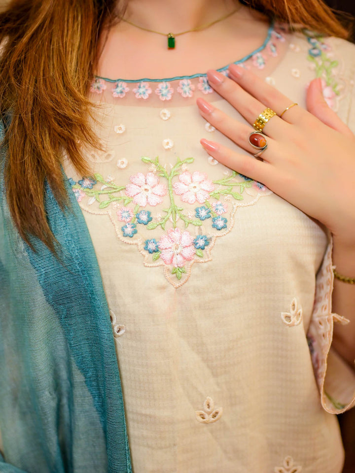 Presenting a sophisticated addition to our Eid Collection, this elegant beige suit is designed for the modern woman. The tailored fit enhances the silhouette, while the neutral tone offers versatility for various occasions. Perfect for celebrating Eid in style, this ensemble combines comfort with a refined aesthetic, making it an ideal choice for festive gatherings.