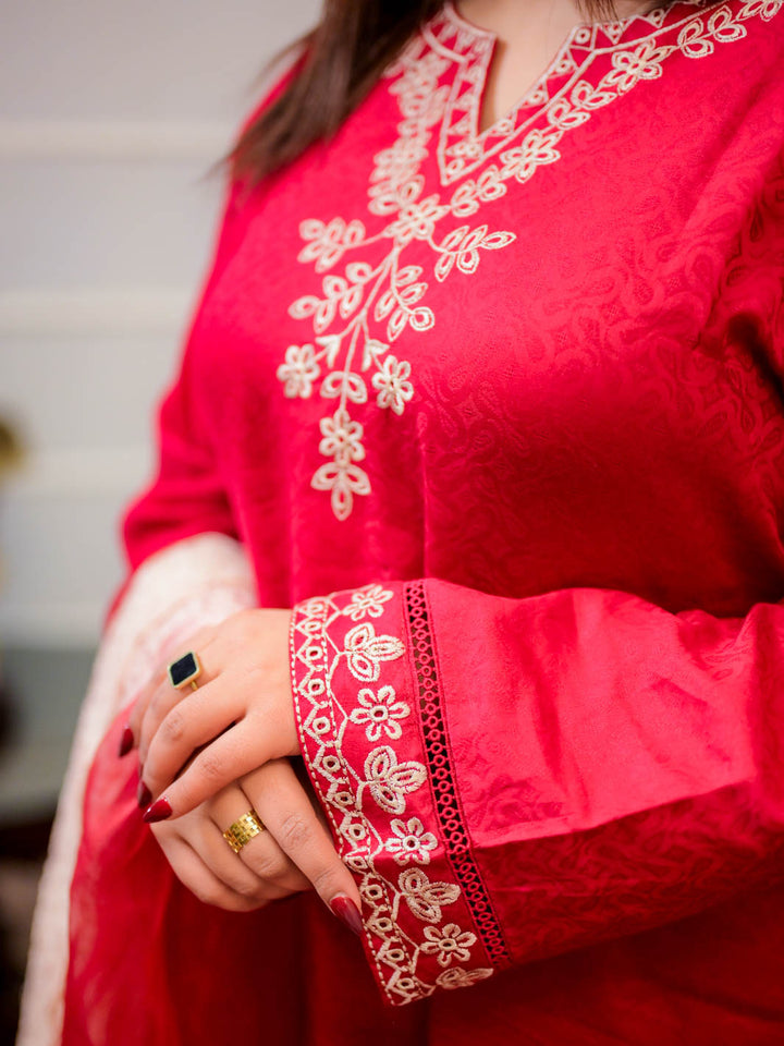 Presenting a stunning piece from our Eid Collection, this elegant woman in a vibrant red dress exudes grace and sophistication. Her poised stance in front of a textured wall enhances the visual appeal, embodying the spirit of celebration and style synonymous with Eid festivities. The rich color and flowing fabric create an eye-catching silhouette, perfect for any festive occasion.