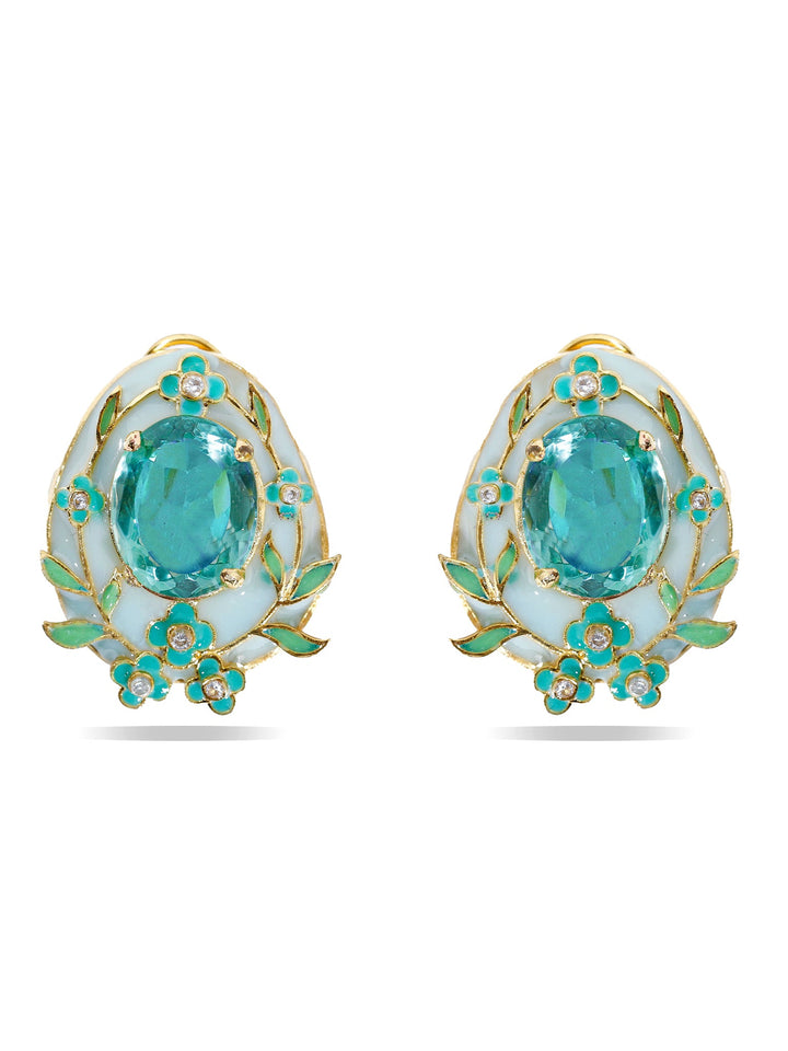 Delicate and dreamy, the Embelia Mist earrings feature a serene aqua centerpiece surrounded by soft enamel blooms and golden leaf accents. Inspired by morning dew and garden whispers, this piece captures an ethereal elegance perfect for daydreamers and romantics alike.