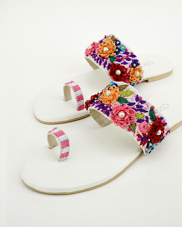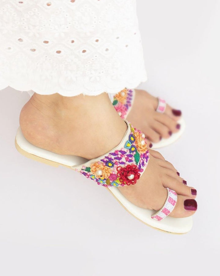 Details: Floral Off white kohlapuris in toe ring style. Completely hand done with different techniques of embroidery