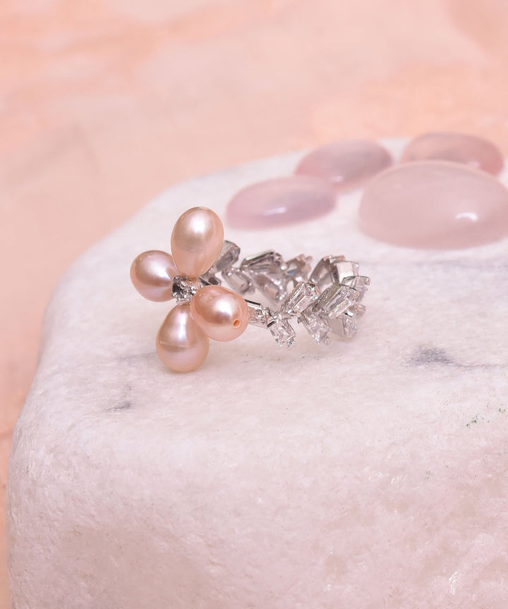 Who needs flowers when you can wear this ring all day long? Beautifully aligned Zircon baguettes combined with peachy pearl flower will become your favorite sight in no time!