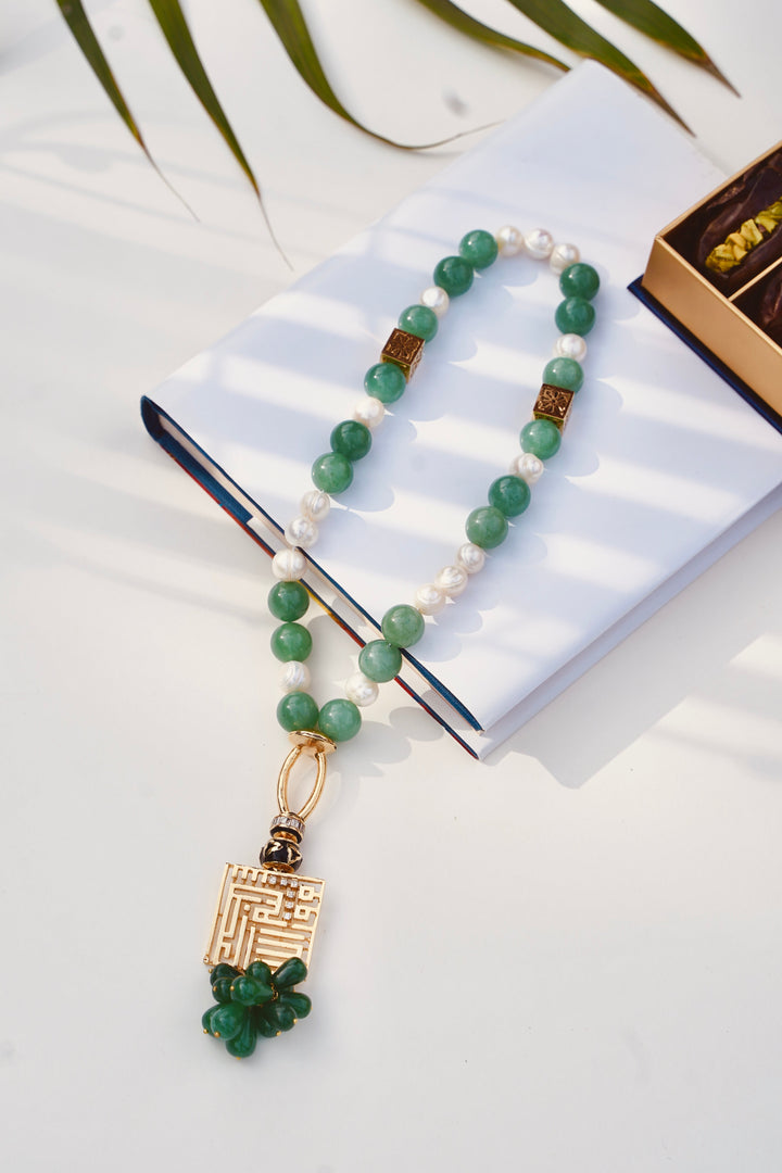 The timeless modern Kufic calligraphy art “Astaghfirullah” paired with Real Freshwater Potato Pearls and Aventurine Stone will remind you of spiritual devotion and prayer. This luxury tasbeeh is perfect for personal indulgence or a thoughtful gift, a meaningful piece to be cherished for generations.