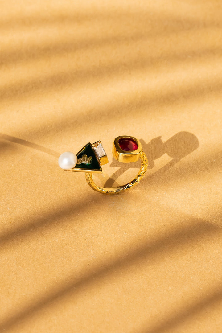 Pair our Glade earrings with the Glade ring, beautifully handcrafted with the gold texture flowers adorning the classic transition of handpainted enamel from emerald to olive green studded with an alluring encasing of baguettes combined with a dangling oval freshwater pearl perfect to compliment your evening look.