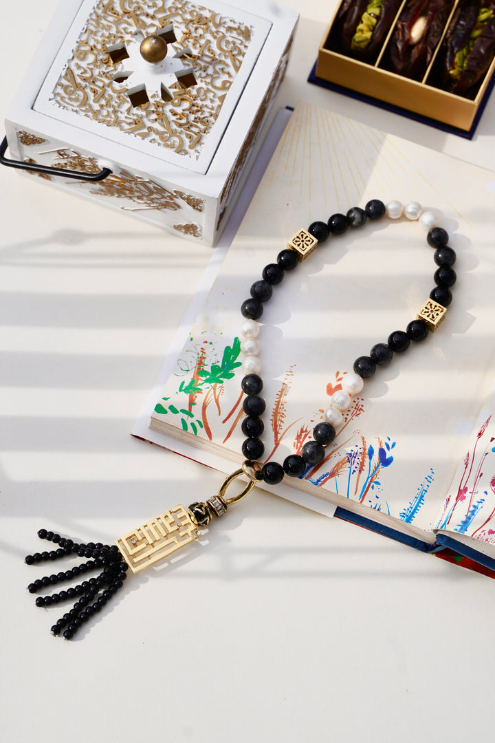 The timeless modern Kufic calligraphy art “SubhanAllah” paired with Real Freshwater Potato Pearls and Black Onyx and Larvikite Stone will remind you of spiritual devotion and prayer. This luxury tasbeeh is perfect for personal indulgence or a thoughtful gift, a meaningful piece to be cherished for generations.