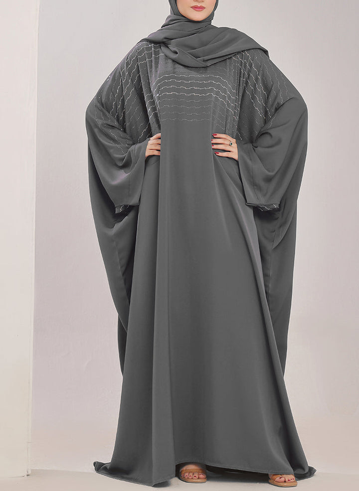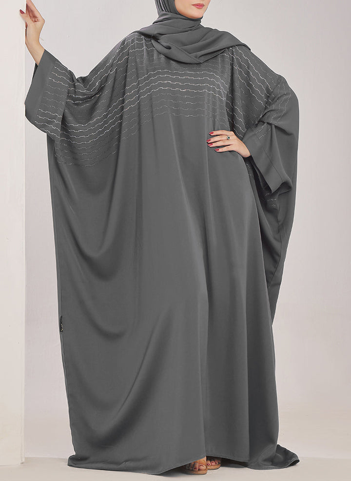 This Grey Jilbab is made from soft Nida fabric and features elegant stone work for a touch of glamour. Comfortable and stylish, it's perfect for everyday wear or special occasions.