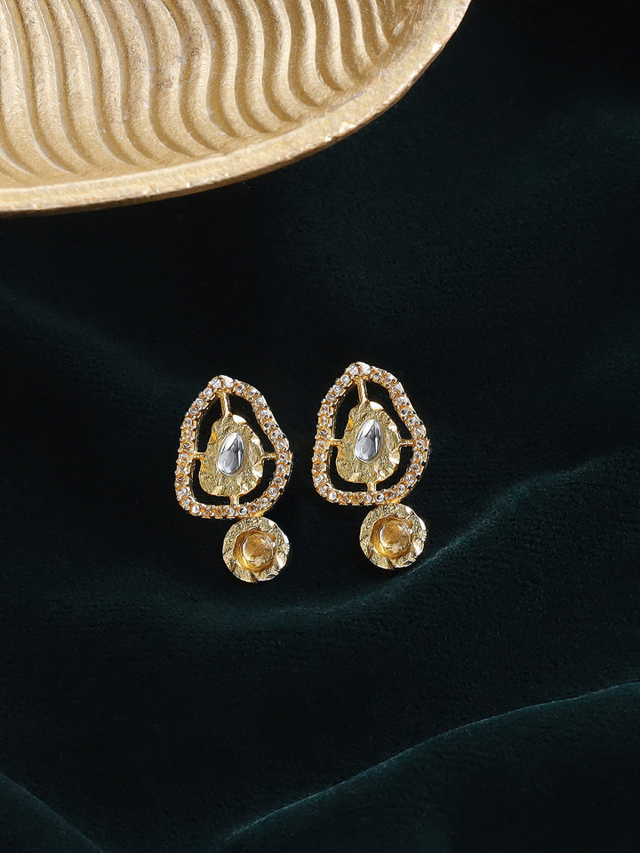 The Hafsa earrings combine textured metal with natural golden topaz stones and kundan accents, complemented by an irregular zircon ring. This unique design offers a perfect balance of elegance and bold detail, making it a striking statement piece for any occasion.
