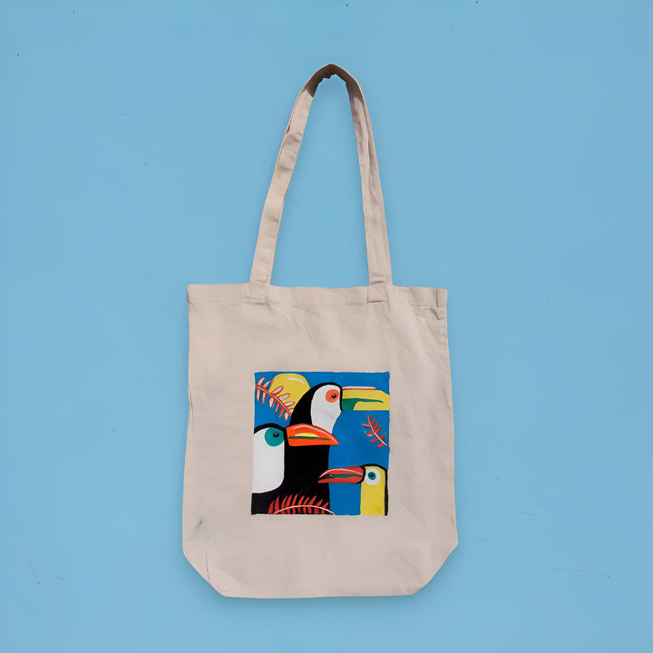 Bring a touch of the tropics to your everyday look with this one-of-a-kind hand-painted tote bag, featuring vibrant toucans perched among lush greenery. Each tote is a unique piece of art, lovingly painted by hand with high-quality, long-lasting fabric paints.