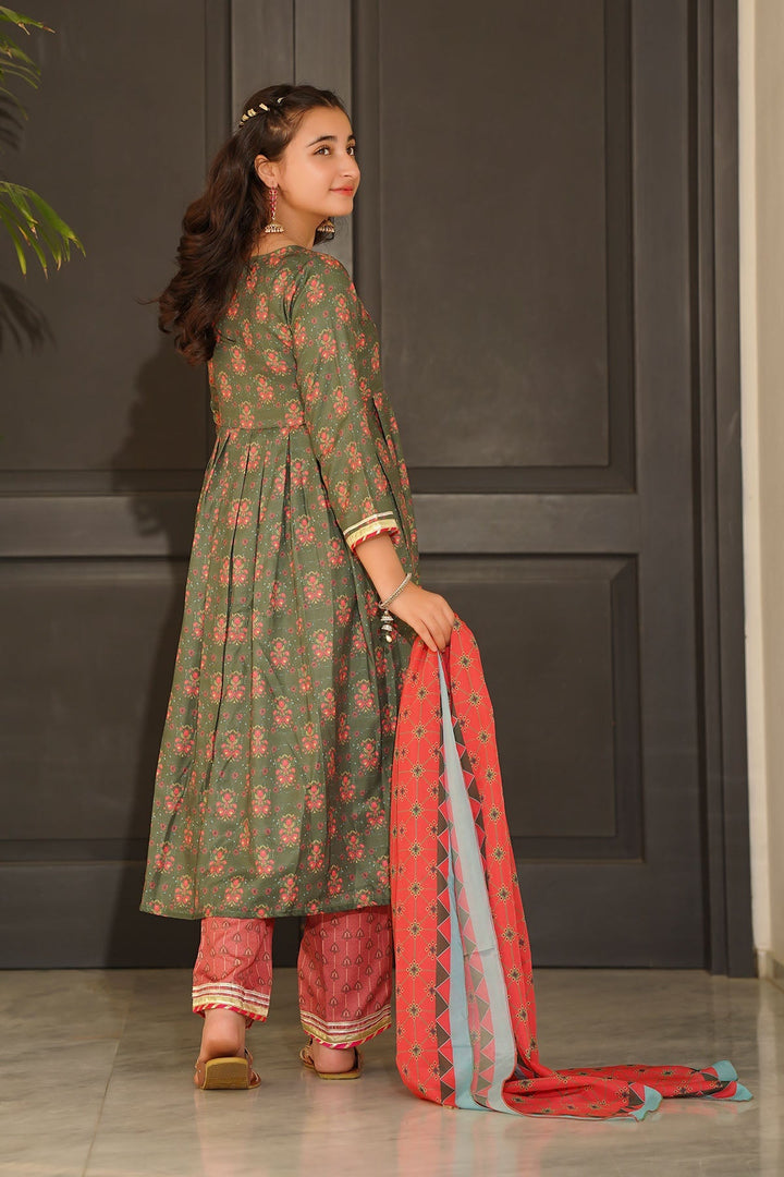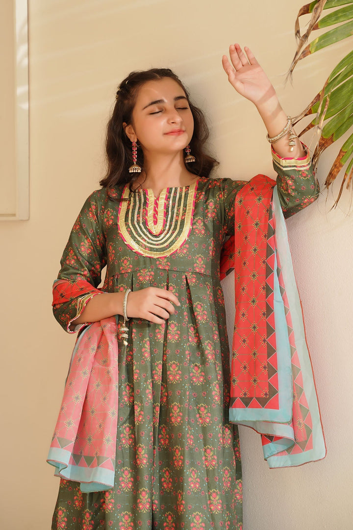Top: Dark Green Herringbone Digital Printed Kurta with Laces