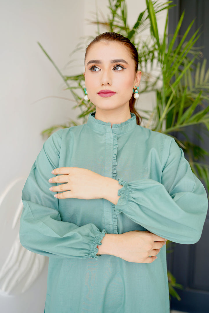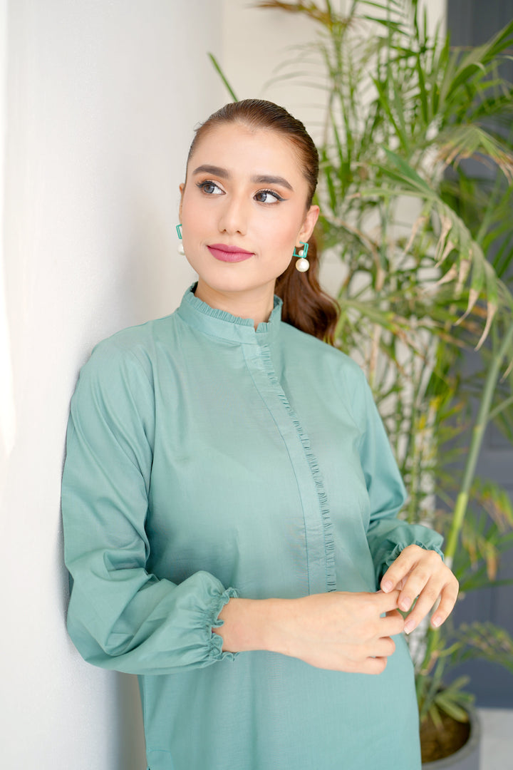 - Straight shirt with ruffles on neck line