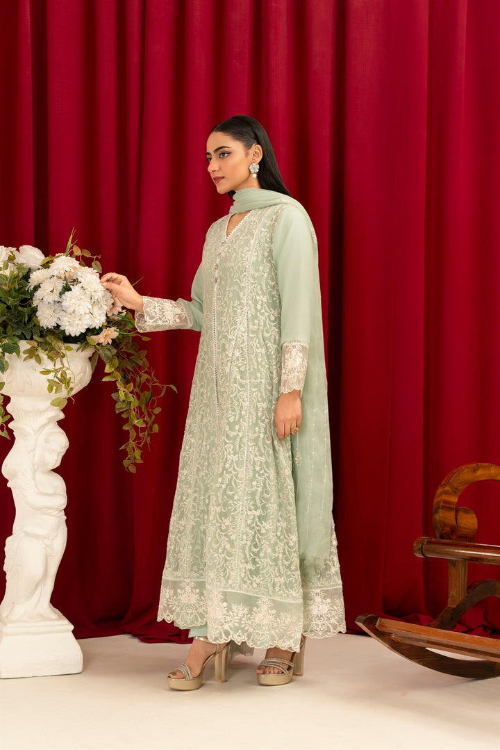 - Additional Description: Step out in style with our latest front open shirt coupled with separate chiffon inner. The embroidery is crafted with resham , lace which is giving an elegant touch to this gorgeous outfit. This sophisticated shirt is paired with a narrow crepe pant .The design serves as the ultimate look to make a classic entrance in formal gatherings. Note: Measurements very according to designs .Trouser patches change in every dress. Remember: Dry Clean Only.