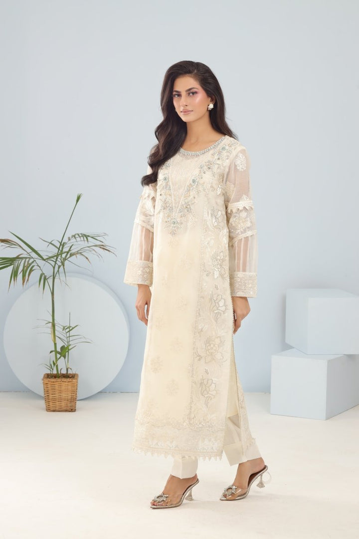 Work : delicate hand work on neck with cora dubka pearls & stones.