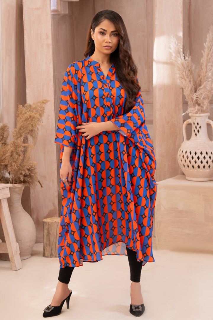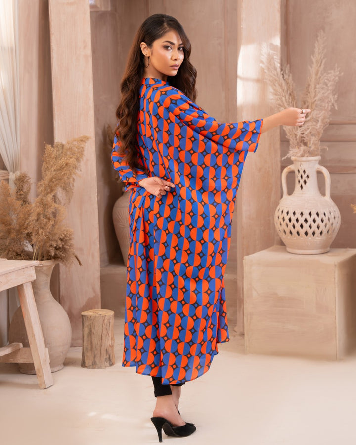 Kaleidoscope a flared shirt made of georgette, this drape shirt boosts a stylish digital print that will elevate any outfit. The band collar and colors add a touch of femininity A soft touch of a button is also enhance the poncho. Perfectly styled as a chic and sophisticated look.