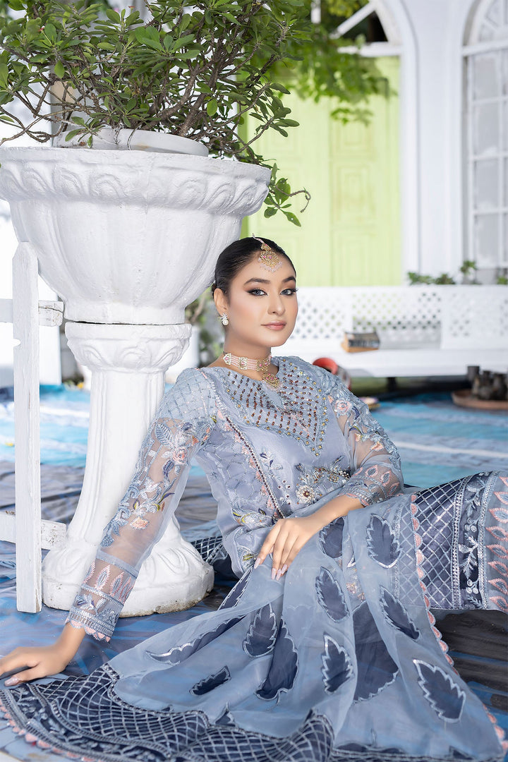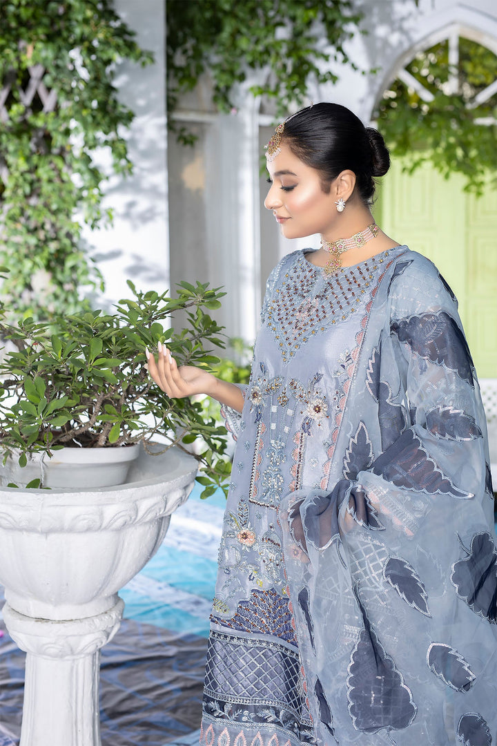 Pastel hues of this dress exude sophistication. This beautiful 3 piece embroidered sequined organza suit is one of the top picks for walima or wedding functions. If we look into the keen details of this dress, then it illustrates cute pinky floral patterns that surely capture the interest. The all-over blue-hued sequin embroidery work on the shirt is very enticing. The dupatta of this floral gray ensemble illustrates scattered pattern work in a darker shade. This is done to compliment the lighter tone of the dress. Get your hands on the best collection of Pakistani bridal dresses now. If you want to know more about the details of the shirt, then it illustrates peachy pink and silver gray tilla work. The trousers of this dress are very simple, and plain and balance the heavy embroidery of the dress.